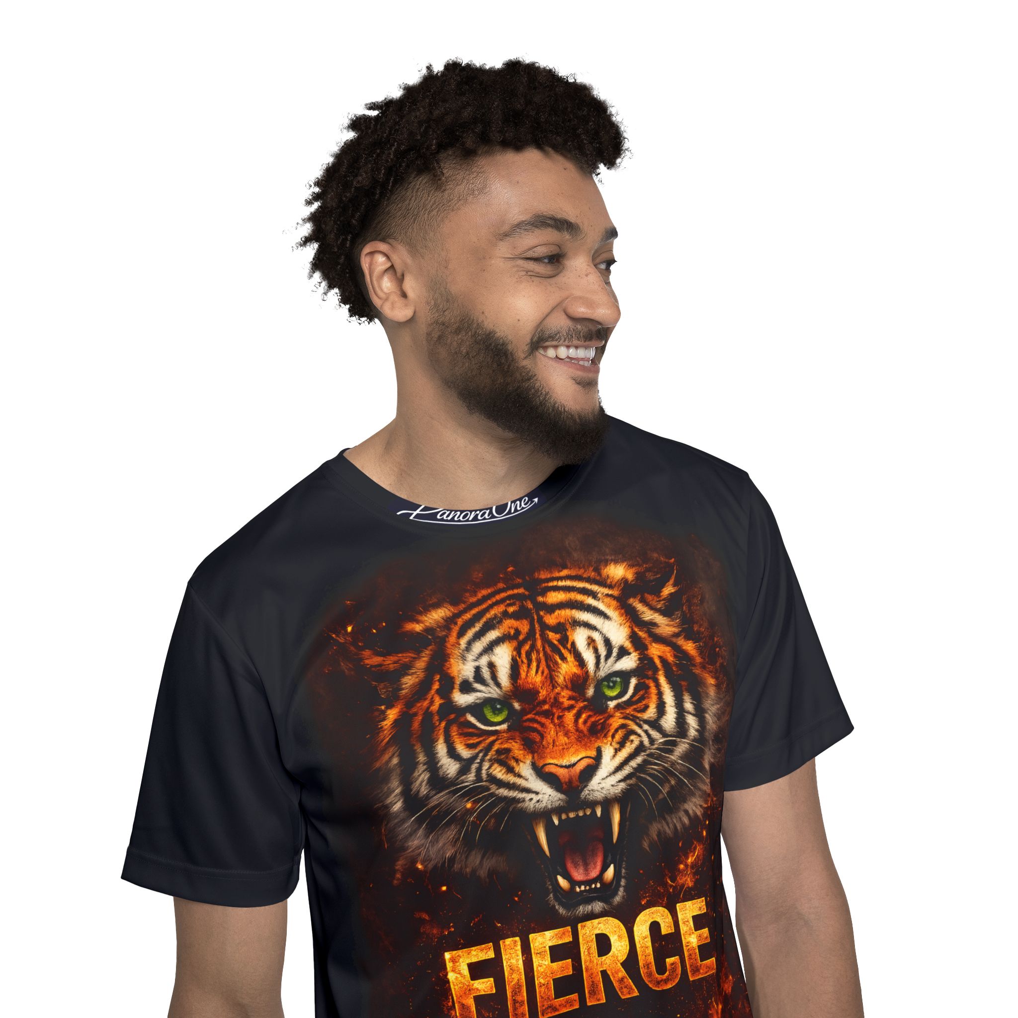 Bring a bold edge to workouts and weekends with this active jersey that roars confidence. The front features a blazing tiger head and the word “FIERCE” set against smoky, ember-like accents — a look that reads as intensity at a glance. Lightweight, quick-dry fabric keeps you cool through sprints and sets, while the classic cut and ribbed collar make it easy to slip on and move without fuss. Wear it when you want to feel charged: training sessions, pick-up games, or when you just need a reminder to stay relentless. The dark base lets the fiery artwork pop, so the shirt reads strong from across the room.